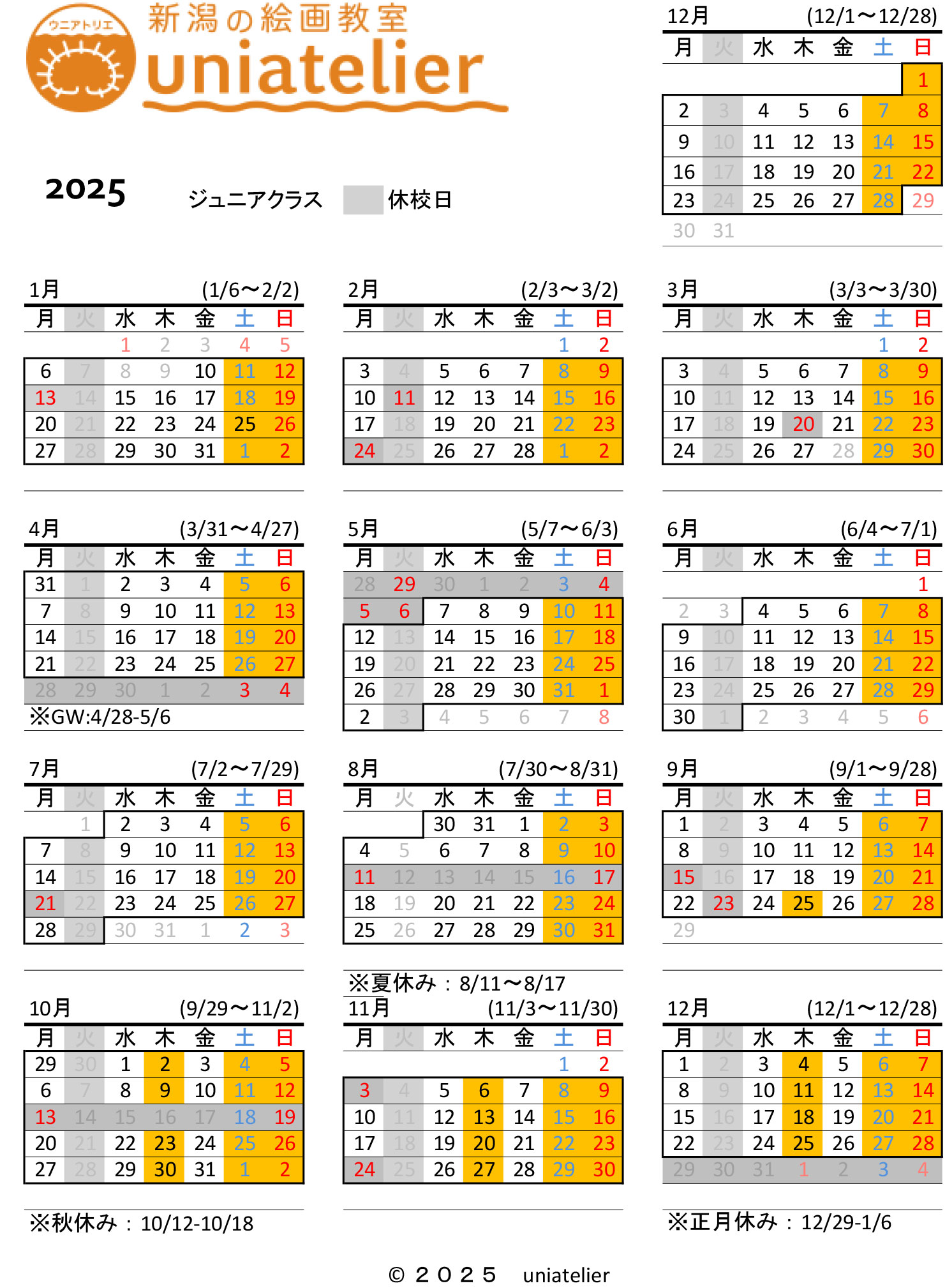 ・1ヶ月の授業日は「授業日カレンダー」黄色の日(4週)です。