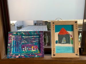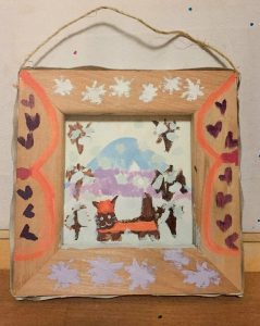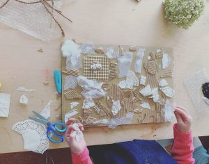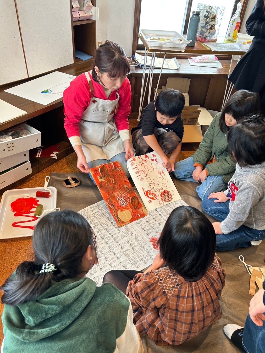 材料:画用紙・版画用インク・段ボール・プチプチ・麻紐など